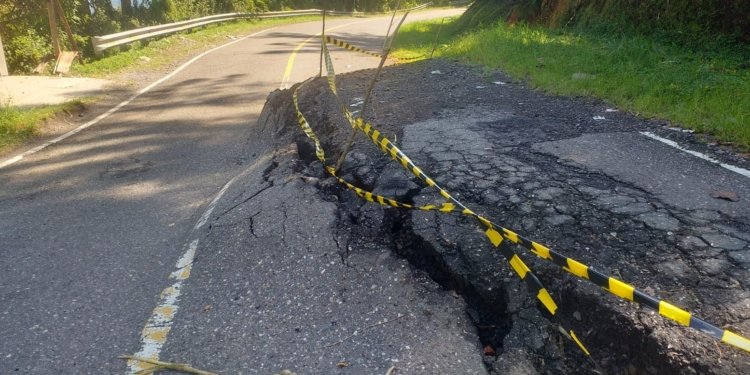 Selain lapisan aspal pada badan jalan yang tampak rusak parah akibat retakan panjang yang ditimbulkan, turunnya badan jalan ini dapat berisiko terhadap keselamatan pengendara.