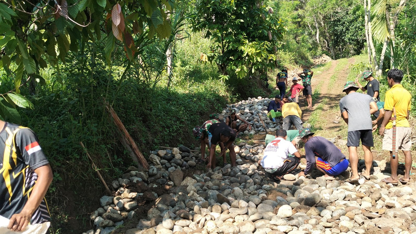 Pada Rabu (22/10), para prajurit TNI terpantau sedang melaksanakan kegiatan fisik berupa pemasangan batu (telford) untuk pembangunan jalan di Desa Rado, Kecamatan Cibal, Kabupaten Manggarai.