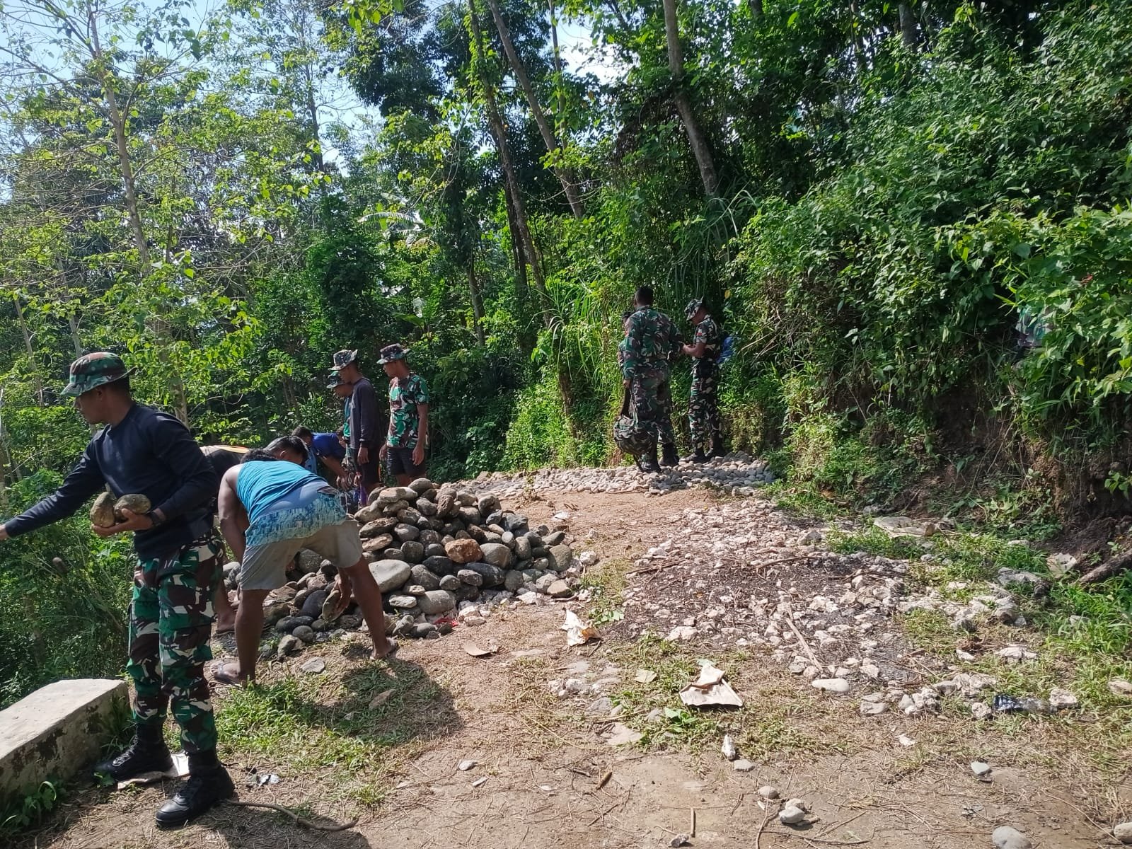Sejak pagi, suara cangkul dan dentingan batu terdengar di sepanjang ruas jalan desa yang menjadi sasaran kegiatan. Warga dan prajurit tampak bekerja tanpa mengenal lelah di bawah terik matahari, menunjukkan semangat gotong royong yang menjadi ciri khas TMMD.