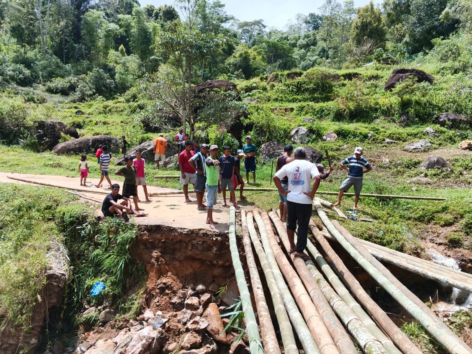 Di tengah kondisi tersebut, warga Kampung Peso bergerak cepat melakukan penanganan darurat secara swadaya. Mereka bergotong royong menggunakan material seadanya untuk menghubungkan bagian jalan yang putus agar bisa dilalui sementara oleh pejalan kaki.